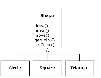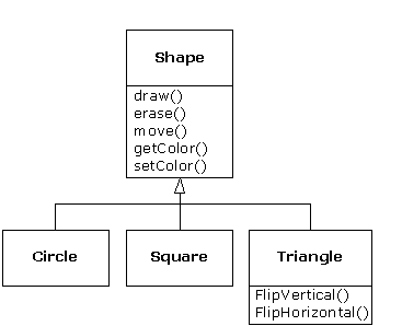 A second example is the classic “shape” example, perhaps used in a computer-aided design system or game simulation. The base type is “shape,” and each shape has a size, a color, a position, and so on. Each shape can be drawn, erased, moved, colored, etc. From this, specific types of shapes are derived (inherited): circle, square, triangle, and so on, each of which may have additional characteristics and behaviors. Certain shapes can be flipped, for example. Some behaviors may be different, such as when you want to calculate the area of a shape. The type hierarchy embodies both the similarities and differences between the shapes.