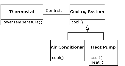 Of course, once you see this design it becomes clear that the base class “cooling system” is not general enough, and should be renamed to “temperature control system” so that it can also include heating – at which point the substitution principle will work. However, the diagram above is an example of what can happen in design and in the real world.