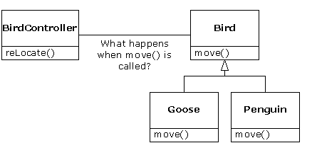 There’s a problem, however, with attempting to treat derived-type objects as their generic base types (circles as shapes, bicycles as vehicles, cormorants as birds, etc.). If a function is going to tell a generic shape to draw itself, or a generic vehicle to steer, or a generic bird to move, the compiler cannot know at compile-time precisely what piece of code will be executed. That’s the whole point – when the message is sent, the programmer doesn’t want to know what piece of code will be executed; the draw function can be applied equally to a circle, a square, or a triangle, and the object will execute the proper code depending on its specific type. If you don’t have to know what piece of code will be executed, then when you add a new subtype, the code it executes can be different without requiring changes to the function call. Therefore, the compiler cannot know precisely what piece of code is executed, so what does it do? For example, in the following diagram the BirdController object just works with generic Bird objects, and does not know what exact type they are. This is convenient from BirdController’s perspective, because it doesn’t have to write special code to determine the exact type of Bird it’s working with, or that Bird’s behavior. So how does it happen that, when move( ) is called while ignoring the specific type of Bird, the right behavior will occur (a Goose runs, flies, or swims, and a Penguin runs or swims)?